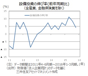 ■財務省は1日、2016年1-3月期の「法人企業統計」を発表しました。全産業(金融・保険業除く)の設備投資の伸び率は前年同期比+4.2%と、15年7-9月期の同+11.2%をピークに低下しましたが、12四半期連続の増加となりました。業種別では、製造業が同+6.7%、非製造業は同+2.9%といずれも15年10-12月期より鈍化しました。