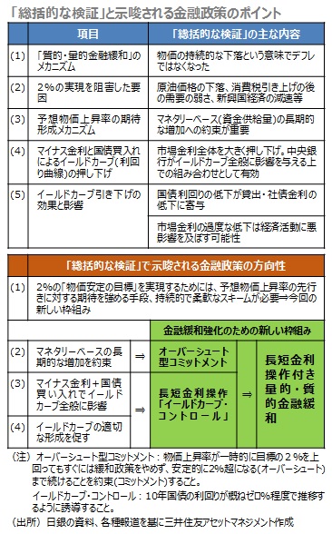 ■「総括的な検証」(*)では、2013年4月以降の金融政策について検証されました。ポイントは、①外部要因により物価目標の2%は未達だが、物価の持続的な下落(デフレ)はなくなった、②マネタリーベース(資金供給量)の拡大は長期的な視点で予想物価上昇率の押し上げ効果を発揮している、③マイナス金利政策+国債買入れの組み合わせは有効だが、過度な市場金利の低下は経済活動に悪影響を与える可能性がある、などです。