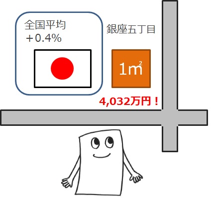 ■最も地価が高いとして有名な東京都中央区銀座五丁目の“鳩居堂前”は4,032万円と、前年度(3,200万円)比+26%と大幅に上昇し、32年連続で日本一となりました。また、バブル直後の1992年を上回って過去最高となりました。