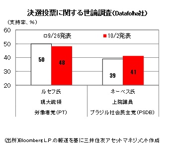 ■ルセフ氏にとっては、景気低迷と物価高などが逆風になっています。ただし、これまでの最低賃金引き上げ策への評価などから、根強い支持があります。一方のネーベス氏は経済政策として中銀の物価目標の重視、税制の透明性や公平性の向上、投資増に配慮しながらの財政赤字削減などを掲げ、支持につなげています。