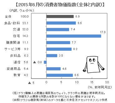 ■6月の消費者物価指数の内訳を見ると、住宅(全体の14.3%)が前年同月比+17.9%と大幅に上昇し、全体を押し上げる主な要因になりました。そのなかでも、家庭向け電力料金は同+58.4%となりました。政府が電力会社への補助金を削減し、値上げを認めたことが背景です。公的部門が財政再建のため公共料金を引き上げ、物価が押し上げられる傾向になっています。