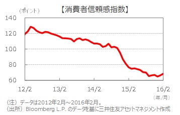 ■25日に発表された2月の消費者信頼感指数は、1月に続き改善しました。同指数は12年の春頃から4年近く概ね低下傾向となっていましたが、政府・中銀の「政策転換」が持ち直しの一因になったと思われます。