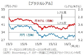 ブラジル議会下院は、4月17日にルセフ大統領に対する弾劾を可決しました。今後、弾劾手続きは議会上院に移ります。上院本会議での弾劾裁判の設置についての採決は5月11日前後に行われる見込みですが、その設置が決まった時点でルセフ大統領の職位は停止され、テメル副大統領が代行することとなります。ルセフ大統領の弾劾が成立し政権交代が実現した場合、市場は新政権の経済運営を見極める展開となると見られます。