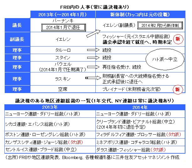 今年に入って、次期FRB議長となるジャネット・イエレン氏の議会承認が終わり、そのほか任期を満了する理事などについても、大統領指名がありました。2月以降のFOMCで議決権を持つメンバーは、以下の表のようにまとめられます。イエレン氏以外で最も注目される人事は、副議長の指名を受けている元・イスラエル中銀総裁のフィッシャー氏(議会承認を経て就任へ)です。