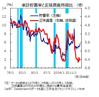 ■ところが、住宅バブルが崩壊した2007年以降、この関係は崩れてしまっています。2016年1-3月期について見ると、当該期末の正味資産から想定される貯蓄率の水準は3.9%程度です。ところが、現実の貯蓄率は5.7%でした。