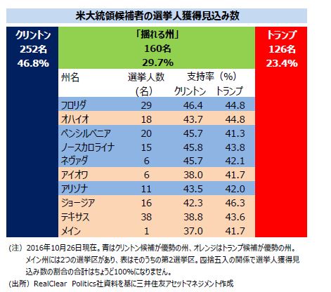 ■両候補とも選挙人の獲得を確かにできていない、いわゆる「揺れる州」は大票田のテキサス州(選挙人数:38名)、フロリダ州(同29名)、ペンシルべニア州(同20名)など10州です。クリントン候補があと18名の選挙人を獲得すれば過半数の270名に到達するのに対し、トランプ候補が大統領選を制するには、「揺れる州」の過半の州で勝利しなければなりません。