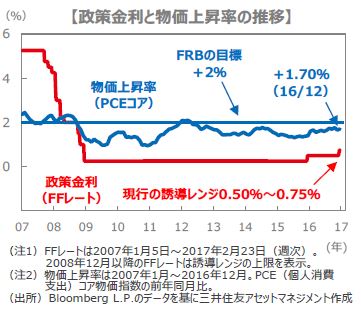■先行きについても、①物価上昇率が依然としてFRBの目標値を下回っている、②将来FRB保有の有価証券の売却が始まると長期金利の押し下げ効果が低減する恐れがある、③急激な利上げによる景気の失速は避けたいなどから、ほとんどの参加者が従来通り「緩やかな利上げが妥当」と判断しています。