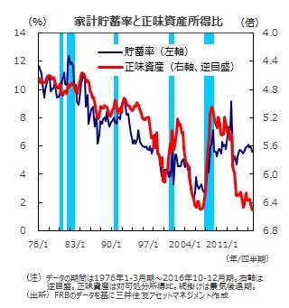 ■かつての米国では、株価や住宅価格が値上がりし、家計の「正味資産」が増えると、消費が拡大し、貯蓄率は低下するという関係が存在しました。いわゆる資産効果です。ところが、2007年に住宅バブルが崩壊して以降、この関係は見られなくなりました。直近2016年10-12月期について見ると、家計「正味資産」の対可処分所得比は先ほど述べた通り6.50倍でした。これに対応する貯蓄率は4.6%と推計されますが、現実の貯蓄率は5.6%でした。
