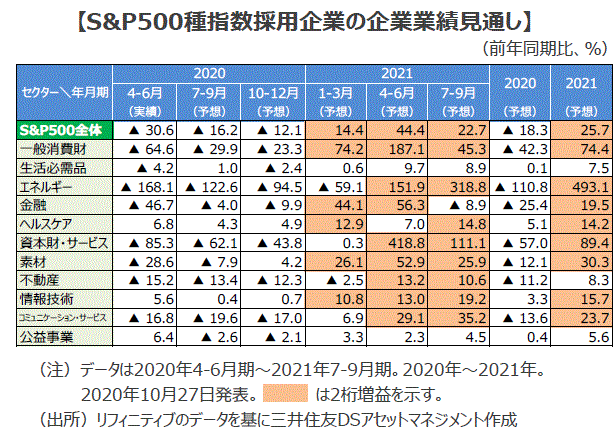■米国大統領選挙が11月3日に迫る中、7-9月期の決算発表が本格化しています。リフィニティブによれば、S&P500種指数採用企業の3割強が決算を発表しました。7-9月期の当期純利益は前年同期比▲16.2%の見通しです(10月27日発表時点)。これは9月末時点の予想(同▲21.5%)より改善しています。
