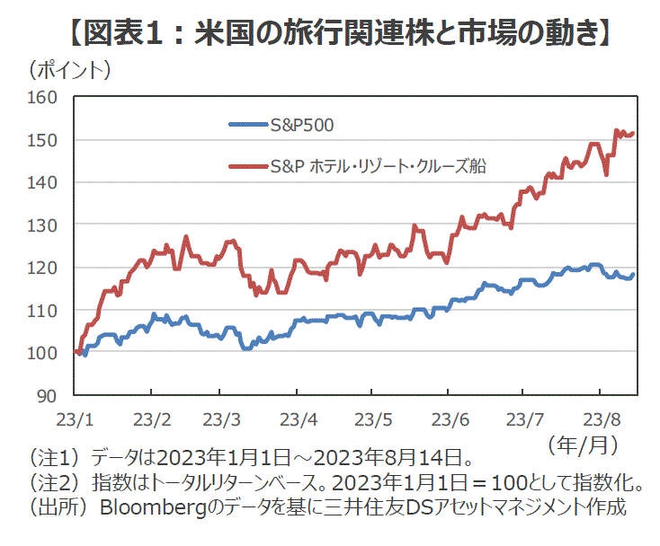 ■S&P500種株価指数でみると、ホテル、リゾート、クルーズ船などで構成する指数は、2022年末からの上昇率が+51.5%と、市場全体の+18.1%を大幅に上回りました(8月14日時点)。