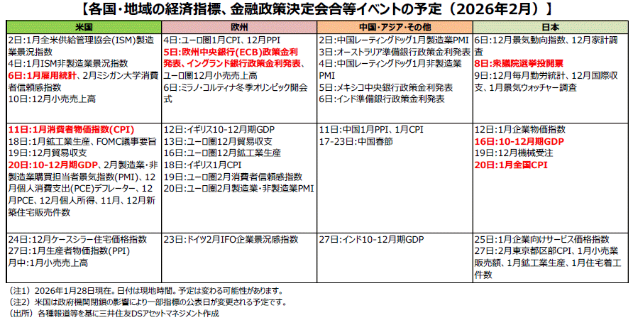 ■20日には、米国の10-12月期実質GDP成長率が公表されます。政府機関閉鎖の影響による下押しも想定される中、個人消費やハイテク関連を中心とした設備投資は底堅く推移していると見られます。今後の金融政策の方向性を見極める上でも、景気水準がどの程度保たれているかに注目が集まります。