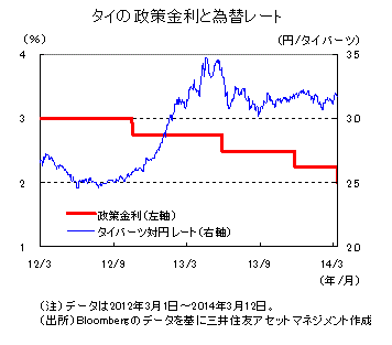 今回の中銀の決定にサプライズは無かったことから、金融市場の変動は限定的となりました。タイの経済は、長引く政治の混乱により、民間消費などの内需や観光業を中心に減速しています。また、タイ憲法裁判所は12日、昨年成立した大型公共事業のための2兆バーツ(約6.4兆円)の特別借入法について違憲判決を下しました。大型公共事業による経済成長の加速が見込まれていたことから、今回の憲法裁判所の判決は経済にとってマイナス材料と見られます。