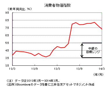 3月の消費者物価指数は前年同月比+7.32%となり、中銀の目標レンジ(+3.5%~+5.5%)の上限を依然として上回っています。ただし、年初より低下基調にあり、中銀は目標に向かい低下していると見ています。主な理由は、昨年6月以降に導入が決定された牛肉など食品輸入規制の緩和や、合計1.75%となった昨年後半の利上げによる効果などです。