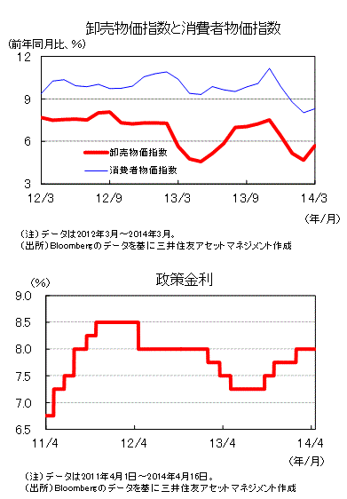 3月の卸売物価指数は前年同月比+5.70%と前月(同+4.68%)から上昇しました。また、消費者物価指数は2月に同+8.03%(改定値)と、2012年1月(同+7.65%)以来の低水準となっていましたが、3月は同+8.31%と上昇しました。