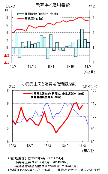 昨年後半から小売売上高の伸びが急回復した背景には、住宅価格や株価の上昇による資産効果、物価上昇による金額面での押し上げなどがあったと見られます。引き続き資産価格の上昇に下支えされながらも、雇用市場の改善が緩やかなことなどから、個人消費は緩やかな回復に止まりそうです。