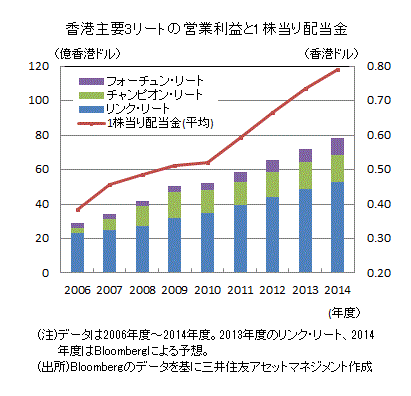 香港の主要3リート(*1)の営業利益は、2013年度(*2)が71.7億香港ドル(前年度比+9.5%)、2014年度が78.6億香港ドル(同+9.7%)と増益基調が続く見込みです。また、好調な業績を背景に、1株当りの配当金(主要3リート平均)も、2013年度は0.74香港ドル(同+10.6%)、2014年度は0.79香港ドル(同+7.2%)と拡大が続く見込みです(予想はブルームバーグのまとめ、以下同じ)。