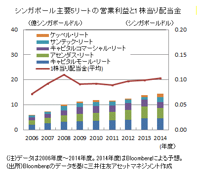 シンガポールの主要5リート(*1)の営業利益は、2010年度、2011年度にオフィスビルが大量に供給されたことなどから伸び悩んでいました。しかし、空室率、賃料などが改善傾向にあり、2013年度の営業利益は13.9億シンガポールドル(前年度比+11.9%)と2桁増益となりました。2014年度はキャピタルコマーシャル・リートがビルの再開発を行うことなどにより費用が一時的に増加することから、主要5リート合計の営業利益の伸びは鈍化する見込みですが、ビルの建て替えが中心で供給量の増加は限定的であるため、オフィスビルの賃料は今後も底堅い動きをする見通しです。2014年度に向け1株当りの配当金(主要5リート平均)は増加傾向を維持しそうです。