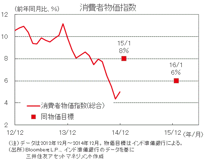■RBIは、物価上昇率が2016年1月の年+6%の目標に沿って推移すると見ています。一方、天候要因による食品価格の上昇や原油価格の再上昇が物価上昇のリスクであるとしました。