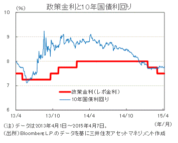 ■景気に関しては、RBIは、これまでの利下げ効果や政府によるインフラ整備に向けた投資の拡大により、2014年度(2014年4月~2015年3月)の経済成長率を+7.5%、2015年度を+7.8%と予想しています。