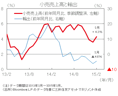 ■小売売上高は、住宅ブームのなか家具や家電が増加したことなどから足元で伸び率が持ち直しました。消費は、ガソリン価格の低下による購買力の向上などから緩やかな回復が見込まれます。