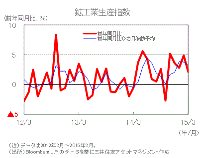 ■3月の鉱工業生産指数は、前年同月比+2.1%と前月から伸びが鈍化しましたが、3カ月移動平均ではこのところ同+3%台で推移しており、生産は拡大基調が続いています。