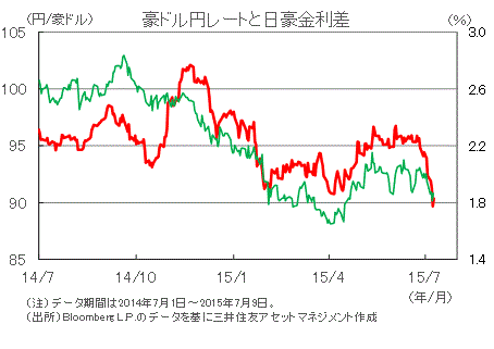 ■豪ドル円レートは、6月下旬以降、中国株式市場の下落やギリシャ問題の不透明感などから下げ足を速めていましたが、中国株式市場が反発するにつれ、足元で反発しています。