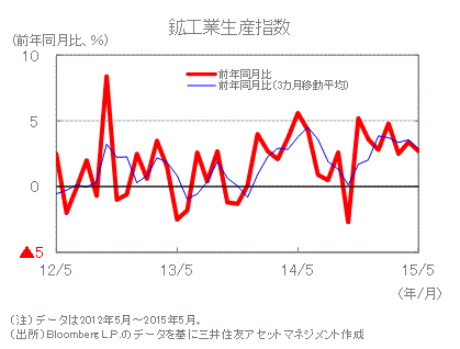 ■5月の鉱工業生産指数は前年同月比+2.7%と前月の同+3.4%(改定値)から低下したものの、年3%前後の拡大基調を維持しています。インド準備銀行(中央銀行、RBI)による利下げやモディ政権の構造改革が下支えとなり、生産は底堅く推移しています。