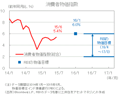 ■6月の消費者物価指数は前年同月比+5.4%と、RBIの2016年1月の物価目標(同+6.0%)を引き続き下回りましたが、前月(同+5.0%)から上昇しました。豆類が同+22.2%となるなど、食品価格が全体を押し上げました。