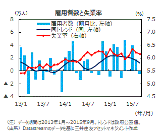 ■9月の雇用者数は前月比0.5万人の減少となりました。月ごとの振れを均すために、政府公表のトレンド値を見ても+1.2万人にとどまり、2015年2月から鈍化傾向にあります。一方、失業率は8月の6.22%から6.16%に小幅ながら低下しました。