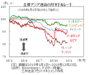 ■12月の米国の利上げ決定を前に、アジアの主要通貨は下落傾向にありました。米国の金利上昇に伴い、アジア諸国から米国への資金回帰が発生するとの懸念が背景にあります。また、中国の景気減速がこの懸念を強めた面もあります。