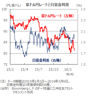 ■豪ドルの対円レートは、足元で軟調に推移しています。中国経済の先行きに対する不透明感、それに端を発する金融市場の混乱から、いわゆる「リスクオフの円高」が進んだためです。1月中旬から同月末にかけては、失業率や雇用者数、小売売上高といった豪州国内の景気指標が市場予想を上回ったことから豪ドルは上昇しましたが、2月に入ると再び中国経済への懸念の高まりや、全般的なリスク回避の流れのなかで、弱含みの推移となっています。