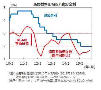 ■15年10-12月期の消費者物価上昇率は、前年同期比+1.7%となりました。豪州準備銀行(RBA)の目標である+2%~+3%の下限を依然として下回っていますが、15年7-9月期の+1.5%からは加速しました。