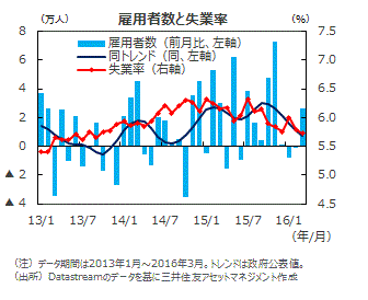 ■2016年3月の雇用者数は前月比2.6万人の増加となりました。雇用統計は月ごとの変動が激しいため、変動を均した政府公表のトレンド値を見ると、3月は同+0.8万人でした。前月の+1.2万人からは鈍化しましたが、企業マインドが改善していることから、今後、雇用の勢いは再び強まる見込みです。一方、失業率は同0.1%ポイント低下の5.7%でした。