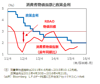 ■15年10-12月期の消費者物価上昇率は、前年同期比+1.7%でした。前期の同+1.5%からは加速しましたが、豪州準備銀行(RBA)の目標である+2%~+3%の下限を下回っています。