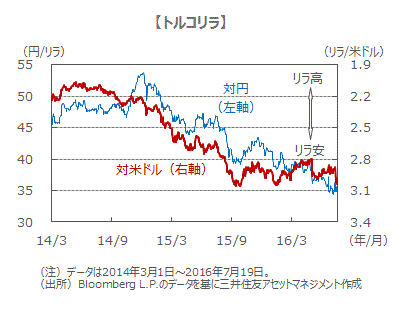 ■クーデター騒動を受けてトルコリラは対米ドルで急落しました。格付け機関のムーディーズ・インベスターズ・サービスは、トルコの長期発行体格付けを格下げ方向で見直すと発表しており、地政学リスクを敬遠する動きが強まる可能性があります。クーデターは未遂に終わりましたが、トルコリラは当面落ち着きどころを探る展開となりそうです。
