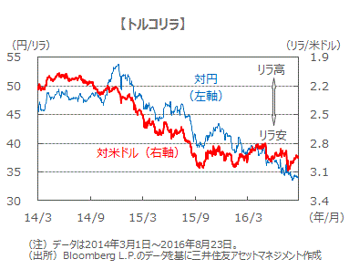 ■7月のクーデター未遂の後、トルコリラは対ドルで過去最安値を付けましたが、米国の利上げ観測が後退したことで新興国通貨が選好され、反発しました。市場は平静を取り戻していますが、テロが相次ぐ中、政治的な混乱が起きれば資金逃避の懸念があり、トルコリラは当面安定を模索する展開となりそうです。