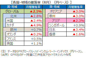 ■オセアニアは、豪州でRBA(オーストラリア準備銀行)が8月2日に利下げを決定しましたが、当面の材料が出尽くしとの見方から反落しました。アジアは、香港が下落、シンガポールが上昇とまちまちでした。香港市場は米国の利上げ懸念が重石となりました。シンガポールはリートの相対的な業績の安定性と高い利回りが下支え要因となりました。