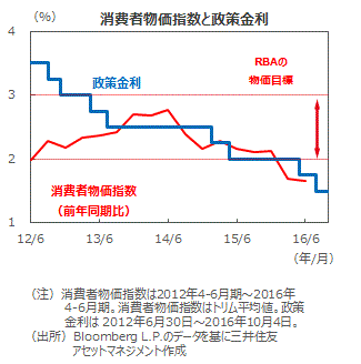 ■消費者物価上昇率は、RBAの注視するトリム平均値(異常値をつけた項目を除いた物価指数)で見て、16年1-3月期、続く4-6月期とも前年同期比+1.7%と、2四半期連続で目標の下限である+2.0%を下回りましたが、国内景気が底堅く推移しているため、据え置いたと考えられます。