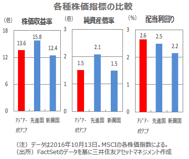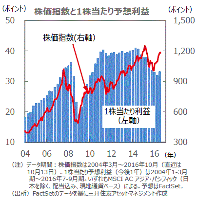■米国の利上げは非常に緩やかなペースとなる見込みです。米利上げ前後で新興国の株式市場が不安定化する局面がないとは言えないものの、経常収支などファンダメンタルズは改善しています。1株当たり利益も4-6月期を底に上向き始めており、17年の増益率は+11.0%(FactSet)と予想されます。アジア・オセアニア株式市場は利益成長を織り込む展開となる見通しです。
