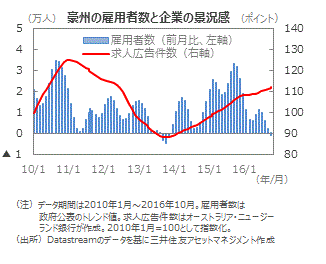 ■2016年10月の雇用者数は前月比1.0万人の増加となりました。雇用統計は月ごとの変動が激しいため、変動を均した政府公表のトレンド値をとると、同0.1万人減となります。トレンド値は5月の1.2万人増をピークに鈍化傾向にありますが、景況感指数は依然として企業の採用意欲が強いことを示唆しています。実際に求人広告件数は増加傾向を示しており、雇用は今後、緩やかに持ち直す見通しです。一方、失業率は前月比横這いの5.6%でした。