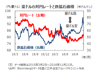 ■RBAは緩和的な姿勢ですが、①中国での需給改善等から、鉄鉱石など資源価格が持ち直してきた、②トランプ次期大統領の拡張的な財政政策により米国、ひいては世界経済の拡大が見込まれるなどを踏まえると、豪ドルは底堅い展開が予想されます。