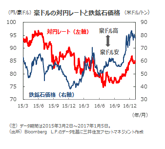 ■豪ドルの対円相場は、昨年半ばを底に上昇基調を辿っています。英国による欧州連合(EU)離脱選択などの影響が一巡したことでリスク回避の動きが後退し、原油や鉄鉱石をはじめとする資源価格の上昇が素直に豪ドル相場に反映されてきたと考えられます。