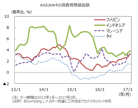 ■東南アジア諸国連合(ASEAN)の主要4カ国(インドネシア、タイ、マレーシア、フィリピン)では、それぞれ17年3月に金融政策決定会合が開かれました。市場予想通り、各国とも現状の金融政策が維持されました。