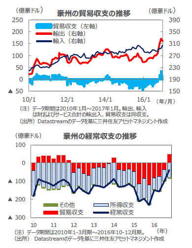 ■貿易収支の改善により、豪州の経常赤字は、過去最大だった15年10-12月期の▲231億豪ドルから直近16年10-12月期の▲39億豪ドルへと、急減しました。なお同期の貿易収支は+47億ドルの黒字でした。