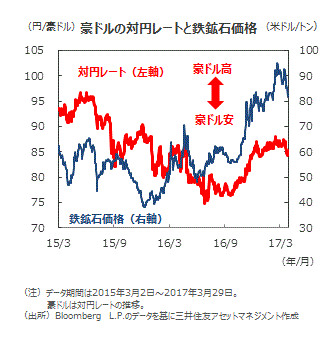 ■豪ドルの対円相場は、中国での需給改善による鉄鉱石や石炭等の資源価格の持ち直しを受け、昨年6月下旬を当面の底に戻り歩調を辿っています。