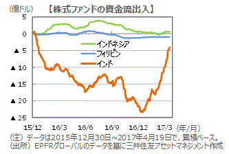■2017年に入ってからのアジア株式市場は、トランプ米大統領の政策への警戒感は燻っているものの、中国やアジア全体の経済の好調さや米ドル高の修正などに見られるような資金流入を背景に総じて堅調な展開が続いています。2016年末から2017年4月21日までの上昇率は、MSCIベース(現地通貨建て)で中国が+14.5%、香港+13.3%、フィリピン+10.8%、インド+10.6%と2桁の上昇となりました。インドネシアも+8.0%と堅調でした。