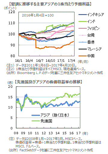 ■なお、先進国株式市場との相対的な位置関係で見ると、アジア株式市場は依然として割安と見られます。株価収益率(株価÷1株当たり予想利益)の水準を比較すると、かい離があります。3月の1株当たり予想利益の伸びは、アジアが前年同月比+7.8%と先進国(同+7.1%)を上回っていることなどから、アジア株式市場は、先進国市場との相対的な割安度を埋め、堅調に推移すると期待されます。
