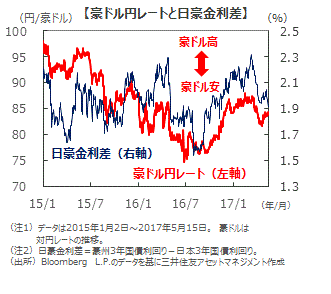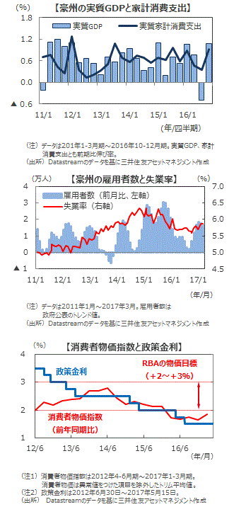 ■17年1-3月期の消費者物価上昇率は、RBAが重視するトリム平均値で見て、前年同期比+1.9%となりました。ガソリン価格の上昇など一時的な要因の影響もありましたが、ようやくRBAの目標値である+2%~+3%の下限に接近しました。今後も景気の持続的な拡大、賃金の上昇に伴い緩やかに上昇する見込みです。