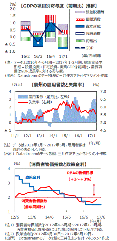■17年1-3月期の消費者物価上昇率は、RBAが重視するトリム平均値で見て、前年同期比+1.9%となりました。ガソリン価格の上昇など一時的な要因の影響もありましたが、ようやくRBAの目標値である+2%~+3%の下限に接近してきました。今後も景気の持続的な拡大、賃金の上昇に伴い緩やかに上昇する見込みです。