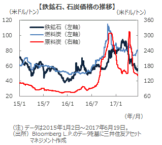 ■石炭は、鉄鋼用原材料としてのコークス製造などに利用される原料炭で見て、17年2月中旬の1トン当たり約150ドルから一時同300ドル台まで上昇したものの下落、直近では急騰前の水準である同150ドル台で推移しています。